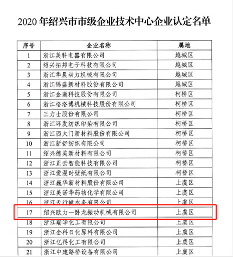 | 近日,绍兴市经信局公布了2020 年绍兴市市级企业技术中心认定名单,欧力-卧龙等45家企业技术中心入选。 |