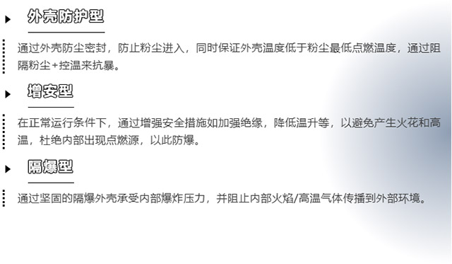 | 在选择防爆振动电机时,必须根据具体的危险区域划分(Zone 0, 1, 2 / Zone 20, 21, 22)、爆炸性物质的类型(气体组别 / 粉尘组别 )、设备表面温度组别以及环境条件来严格选择合适的防爆等级和防护等级。 |